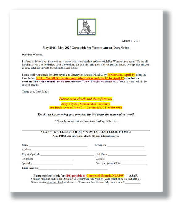 Please note that this is an opportunity for all members to support Greenwich Pen Women. (An email with the Zoom link was sent to you on Feb. 10) or check our calendar!