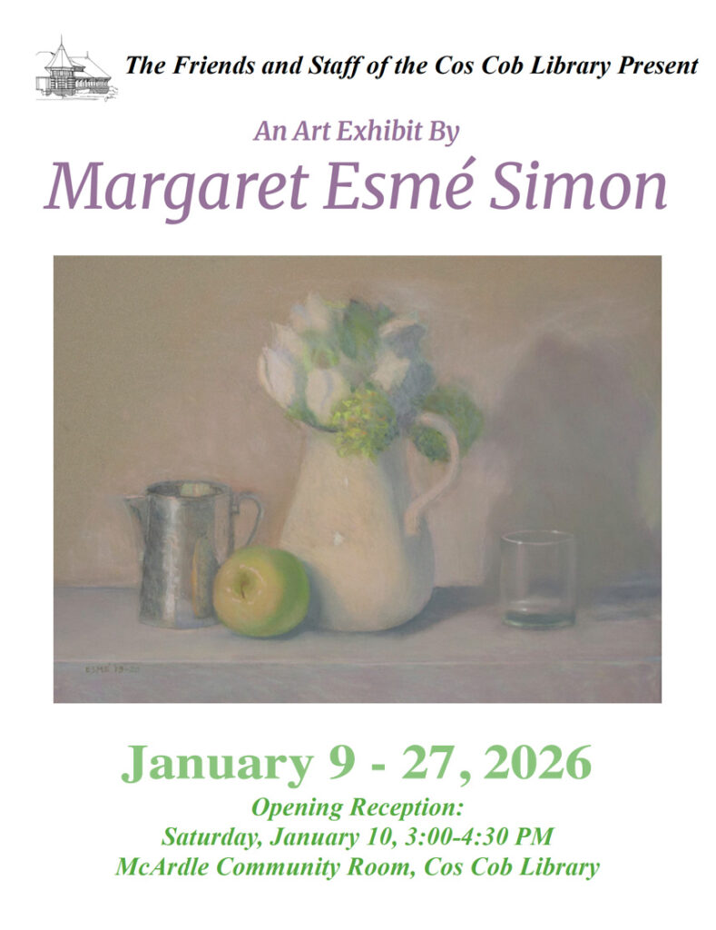 Margaret Esme’ Simon will have a solo show at the Cos Cob Library, in the McArdle Community Room from January 3 – 27. The Library is located at 5 Sinoway Road in Cos Cob, 06807. Hours are Mon: noon – 8:00, Tues: – Fri: 9:00 – 6:00, Sat: 9:00 – 5:00, Sun: Closed. There will be a reception on Saturday, January 10th from 3:00 – 4:30.